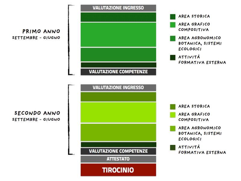 Agronomia, botanica, ecologia, disegno e tecnologia dei materiali, composizione e progettazione giardinistica, impiantistica e manutenzione, storia dei giardini e dei parchi, restauro dei giardini, legislazione del verde, pianificazione e progettazione paesaggistica, aspetti legislativi, capitolati d’appalto e computi metrici. Alcuni sabati sono inoltre previste visite a ville storiche, vivai specializzati e cantieri.